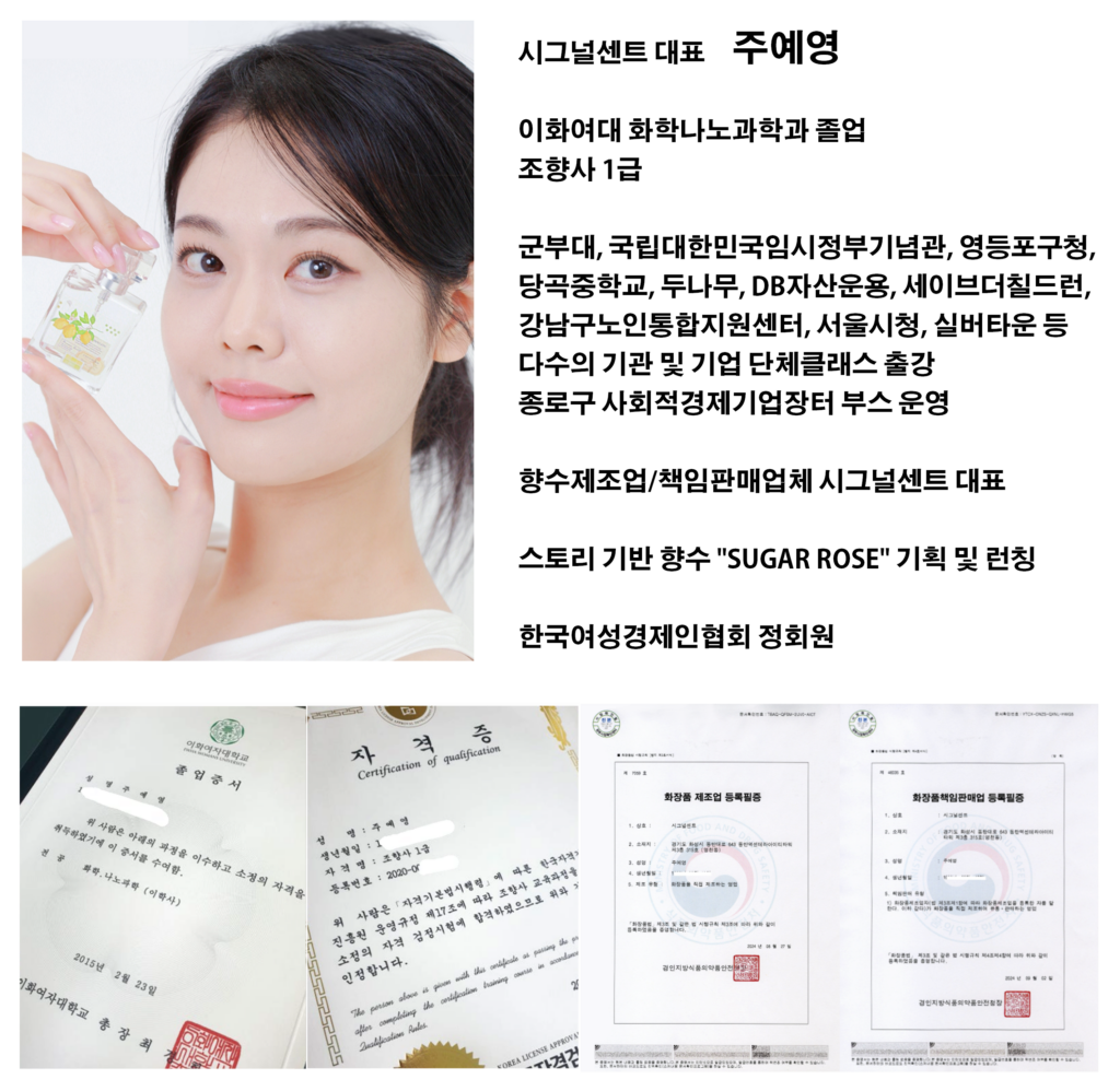 2025년 05월 29일2026년 04월 12일 인사말 맞춤형 향수 제조 및 판매 + 향수만들기 단체클래스 출강 전문 <시그널센트 소개목차> 인사말 사업개요 제품개요 (제조업) 서비스개요 (클래스 출강) 사업 소개
